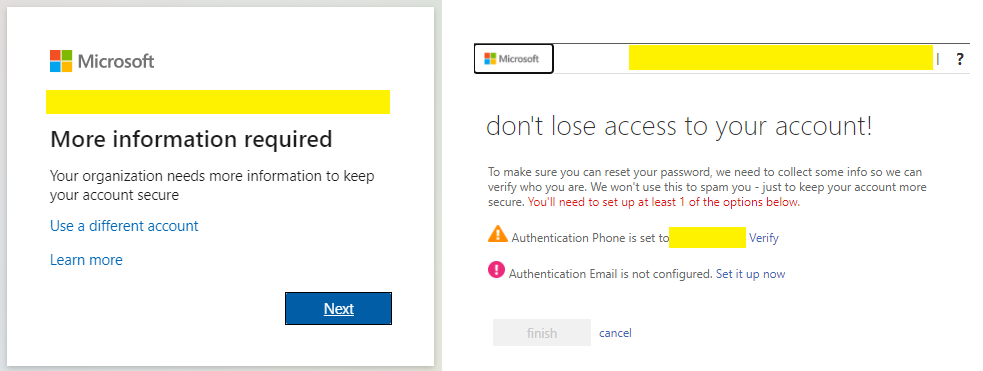 AzureAD users who are signing in for the first time after SSAM has been enabled, will be prompted to identify a secondary identification method, whereby an automated SMS and/or eMail can be delivered with a code to assist with the forgotten password process. Users should click the 'verify' option which will request a contact mobile number and send an initial code to confirm the correct number for future use.